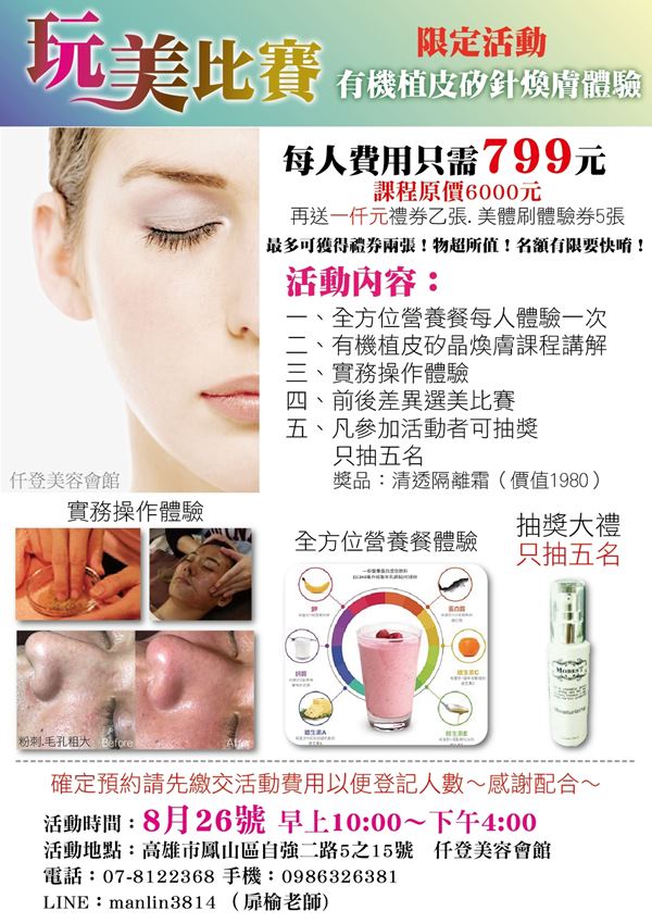 8月26日【限定】當日活動!玩美比賽有機植皮換膚體驗只需799元~名額有限快來報名