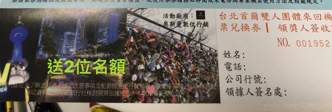 消費滿1500起 抽2名 直飛韓國首爾來回機票 市價1萬元 物超所值